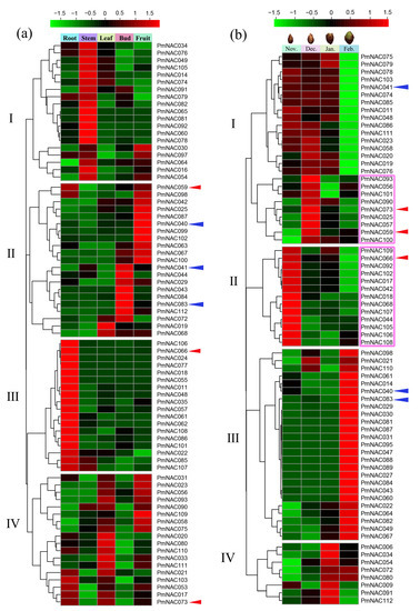 To investigate the specific expression of PmNACs, we analyzed the expression patterns of PmNAC genes in root, stem, leaf, bud and fruit; flower bud in November, December, January and February; and stems from Beijing, Chifeng and Gongzhuling during autumn (October), winter (January) and spring (March) based on available transcriptome data [62,63]. In all tissues, PmNACs with the Fragments Per Kilobase Million (FPKM) >1 were collected for further analysis. We found that 76 PmNAC genes showed specific expression in root, stem, leaf, bud and fruit (Figure 5a); their FPKM value is shown in Table S6. PmNACs with similar expression patterns were clustered into the same subset. As shown in Figure 5a, PmNACs in subset I presented relatively higher expression levels in the stem, and most of these genes were mainly related to secondary wall formation. For instance, PmNAC016/60/065 were orthologous genes of Arabidopsis XND1, NST1, and VND4, respectively (Table S6). PmNACs in subset II presented specific expression in fruit and bud, including three Pmu-miRNA164 targeted genes PmNAC040/041/083. PmNACs in subset III showed higher expression levels in root, including a more highly expressed trans-membrane gene (PmNAC066). The expression of PmNACs in subset IV was not very specific, and most of them were expressed in root, leaf and fruit.