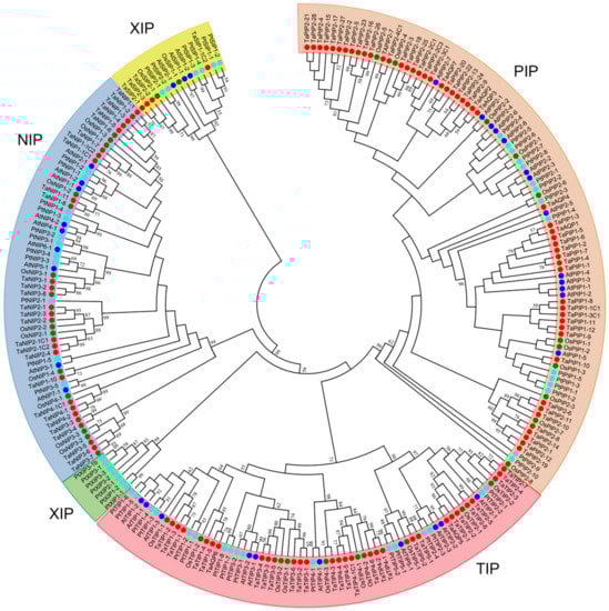 Phylogenetic tree for Aquaporins (AQP) identified in Triticum aestivum, Arabidopsis thaliana, Populus trichocarpa and Oryza sativa. Five protein families (PIP, NIP, TIP, XIP and NIP) were identified. In red circles, 113 AQPs from wheat; in light-blue, 56 from P. trichocarpa; in dark-blue, 36 from A. thaliana; in green, 33 from O. sativa (Table S4).
