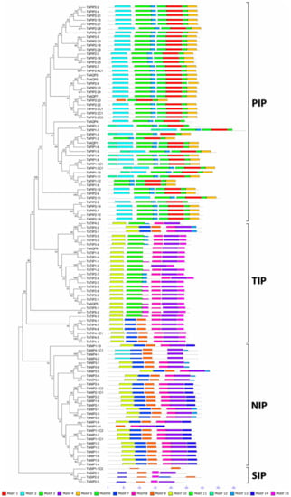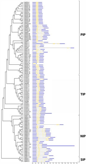 Consistent with the AQP classification of O. sativa [], H. vulgare [], A. thaliana [] and P. trichocarpa [], the 113 wheat AQP genes total grouped in 4 families: NIP, TIP, PIP and SIP. At the same time, NIP separated according to the pattern of conserved motifs of 5 subfamilies: NIP1, NIP2, NIP3, NIP4 and NIP5; PIP of 2 subfamilies: PIP1 and PIP2; TIP of 5 subfamilies: TIP1, TIP2, TIP3, TIP4 and TIP5; and SIP of 2 subfamilies: SIP1 and SIP2. The structure of these groups is closely related to the genetic relationships with O. sativa, A. thaliana and in a lower degree with P. trichocarpa, which supports previous phylogenetic classifications [,,]. Coincidentally, the structural exon-intron patterns of the genes of all subfamilies of wheat AQPs are specific to each subfamily and similar in number and length only to closely related species, such as H. vulgare []. It would reflect a high degree of conservation for this gene family, despite the processes of natural and artificial polyploidy that occurred in wheat [].