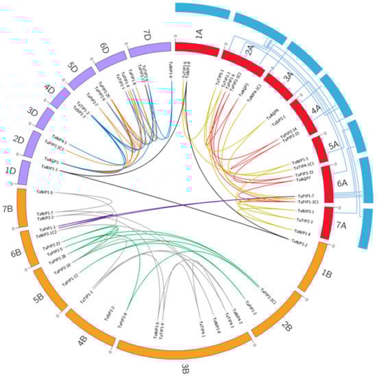 From the 113 AQP genes identified, the chromosomal location of 76 genes was determined and 8 clades of paralog genes were established (Figure 4, Table S9). Among them, 35 genes were located in sub-genome A, 42 in B and 36 in D. All chromosomes include AQP genes. The sets of chromosomes 7 and 1 were those with higher and lower abundance of genes, with 21 and 6 AQP genes, respectively. Polyploidization events play an important role in the expansion of the AQP genes in wheat, whose origins go back to the hybridization events between the species of T. urartu, A. speltoides and A. tauschii []. In this way, wheat had 24 groups of genes that were homolog copies on each of the A, B and D chromosomes, 15 pairs were on the A, B or D chromosomes and 11 genes were unique copies. Among them, TaAQP3 – TaPIP2-24 and TaPIP2-27 – TaPIP2-28 were tandem duplications and 21 pairs were segmental duplications concentrated mainly in the PIP family (Table 1 and Table S10). In the same context, to determine if the array of genes of the AQP family on the D sub-genome of wheat was conserved with respect to the genome of T. urartu, 24 pairs of orthologue genes were identified. Interestingly, some of these genes could be associated with the abiotic stress tolerance capacity of T. urartu. Among them, 8 genes maintained their chromosomal location in respect to wheat genome (Figure 4, Table S11), evidencing a medium collinearity level between the AQP genes of both species. This suggests that about half of the genes have changed their chromosomal location in the D sub-genome due to chromosomal inversion and crossover events.