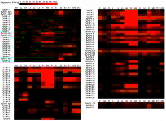 Analysis of AQP expression in different organs and developmental stages of wheat. Each heatmap corresponds to a subfamily of AQP. The intensity of the red color indicates the level of up-regulation of the gene in FPKM values. Development stages are indicated according to Zadoks scale: G1: Grain_Z71; G2: Grain_Z75; G3: Grain_Z85; L1: Leaf_Z10; L2: Leaf_Z23; L3: Leaf_Z71; R1: Root_Z10; R2: Root_Z13; R3: Root_Z39; S1: Spike_Z32; S2: Spike_Z39; S3: Spike_Z65; ST1: Stem_Z30; ST2: Stem_Z32; ST3: Stem_Z65. Microarray data were obtained from [].