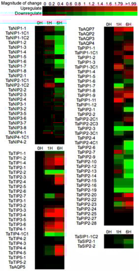 Analysis of AQP gene expression of wheat seedling leaves under osmotic stress. Green indicates a negative change or down-regulation and red indicates a positive change or up-regulation at 1 or 6 hours after treatment. The intensity of the colors indicates the fold change. Microarray data were obtained from [].