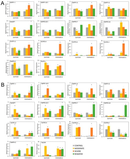 To investigate in more depth the relationship between the expression patterns of AQP genes and the tolerance capacity of wheat, we performed an analysis of relative expression of some genes previously mentioned by qPCR in leaves and roots between two wheat genotypes (accessions) with contrasting tolerance responses to water deficit (Figure 7). In this sense, we observed important differences at the transcript level between the drought-tolerant (Fontagro 8) and the drought-susceptible genotype (QUP2569). In leaves, as stress intensity increased, some AQP genes of the PIP1 and PIP2 subfamilies, like TaPIP1-1, TaPIP1-5, or TaPIP2-24, were clearly up-regulated in the tolerant genotype, whereas in the genotype susceptible the expression levels were down-regulated (Figure 7A). In the case of the TIP family, they also increased their expression levels during severe stress. On the other hand, an opposite effect was seen in the expression of AQP genes in roots, where the tolerant genotype showed a down-regulation of TaPIP1-1, TaPIP1-5, TaAQP7, TaPIP2-1C1, TaTIP2-1, TaTIP3-4 and TaTIP4-1 genes under moderate stress, while the susceptible one presented up-regulation (Figure 7B). Interestingly, during the rehydration of the tolerant genotype, several genes of the PIP2 subfamily were induced in leaves and roots. This could be associated with a better internal water balance and faster rehydration ability of Fontagro 8.