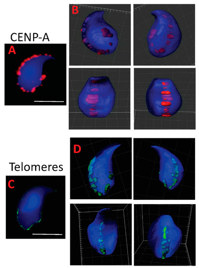 Representative image of telomere and centromere positions in WT mouse sperm nucleus. The centromere-specific histone H3 variant (CENP-A, red (A,B)) and telomeric probes ((C,D), red) were used in immunofluorescence or FISH approaches, respectively. Nuclei were stained blue with DAPI. Nuclei were captured in Z-stack, using confocal microscopy, and subjected to deconvolution (Huygens software, Netherlands). The 3D models were obtained with Imaris software (Bitplane, Switzerland). The set of views per staining represented is a representative nucleus from a pool of 30 spermatozoa. Scale bar in confocal images represents 5 μm (white line).
