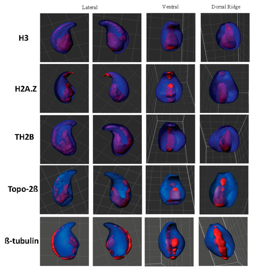 Using immunocytochemistry and FISH, we further investigated the localization of particular chromosomal subdomains, namely centromeres and telomeres. To do so, we used a pan-centromere specific H3 variant (CENP-A) antibody to detect this ubiquitous centromeric protein (Figure 2A). 3D reconstruction using Imaris software showed that centromeres aligned and clustered along the dorsal and basal ridges of the sperm head (Figure 2B). A similar localization was observed by FISH when looking at telomeres (Figure 2C,D) suggesting that in the mouse sperm nucleus, centromeres and telomeres co-localize. No difference in the localization of centromeres and telomeres was recorded when Gpx5−/− sperm nuclei were examined (data not shown). We used three specific histone antibodies (1 canonical and 2 testis-specific variants, respectively, H3, TH2B, and H2A.Z) to corroborate and complete earlier reported partial observations [35] regarding the localization of persisting histones in the mouse sperm nucleus, in immunofluorescence confocal microscopy approaches, associated with 3D Imaris reconstruction. We confirm the basal and dorsal peripheral localization of these persisting histones and their consistently overlapping localization (Figure 3). The 3D Imaris reconstruction, shown in parallel (right panels) in the same Figure, clearly reveals the basal and dorsal ridge localization of these histone-rich domains in what could be designated a “punk-head” distribution. Topoisomerase 2ß, a sperm nuclear matrix protein (Figure 3), as well as the classical cytoskeleton protein ß-tubulin (Figure 3), also fall into these dorsal peripheral and basal ridge domains as was partly shown in the earlier study [30].