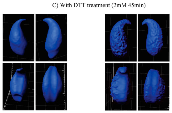 Taking advantage of the confocal images and the power of the Imaris software analysis, we looked in more detail at sperm nuclear 3D-parameters, including volume and surface area, comparing WT and Gpx5−/− spermatozoa. An average value for each parameter (volume and surface area) was obtained from each sample and each condition tested (untreated, NaOH- or DTT-treated) by looking at a pool of thirty spermatozoa. The data are presented in Table 2. Untreated WT spermatozoa showed a mean nuclear volume of 66 µm3 and a mean nuclear surface area of 93.9 µm2. These parameters were significantly different in Gpx5−/− spermatozoa, which had a mean nuclear volume of 54.8 µm3 (p < 0.001) and a mean surface area of 80.2 µm2 (p < 0.001), revealing a greater state of nuclear condensation. Examination of the detailed shape of the 3D-reconstructed sperm nuclei revealed repeated differences between the WT and Gpx5−/− animals. As shown in Figure 4, with representative photographs of 3D-reconstructed nuclei, Gpx5−/− sperm nuclei present a smoother surface when compared to the more irregular aspect of the WT sperm nuclei. The use of different mild denaturing treatments, namely DTT (2 mM) or NaOH (1.5 N), revealed distinct reactions when WT sperm were compared to Gpx5−/− sperm and confirmed the specific effect of oxidation on the sperm nucleus. As presented in Table 2, when NaOH was used to produce a mild denaturation of the sperm chromatin (by classical breakage effects on the hydrogen bonds linking DNA base pairs), we recorded/observed a significant increase in sperm nuclear volume and surface area, in both genetic backgrounds (WT and Gpx5−/−). However, Gpx5−/− sperm nuclei remained more condensed than WT following treatment with alkali. In contrast, when DTT (a non-ionic detergent that specifically reduces disulfide bonds to free thiols) was used, we observed a marked effect on both sperm nuclear volume and surface area, in the Gpx5−/− mice, as compared with WT controls (Table 2). This is in agreement with the idea that although Gpx5−/− sperm nuclei appear more condensed, they also appear to be significantly less robust when exposed to a mild, reducing environment. These differences in the nuclear reactivity of oxidized or non-oxidized sperm nuclei, when exposed to mild denaturing conditions, can be visualized, as shown in Figure 4. In panel C (Figure 4C), when no denaturing treatment was performed, the Gpx5−/− sperm nuclei presented the smooth aspect, as noted above. When NaOH was used as a mild denaturing treatment, there was no significant change regarding the smooth shape of the sperm nuclei in either genetic background (Figure 4B). However, when mild denaturation was carried out with DTT, it was obvious that the Gpx5−/− sperm nuclei then presented a dense granular aspect (Figure 4C) that was not observed in the WT.