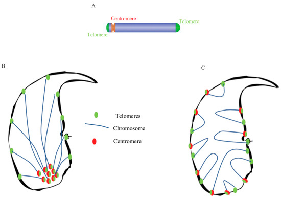 Schematic representation of the proposed models of telomere and centromere organization within murine sperm nuclei. Panel (A) presents a schematic representation of the murine acrocentric chromosome with two telomere regions (green) at either end of the chromosome and one centromere (red). Panel (B) presents a schematic representation of the murine chromosome model in which the centromeres (red) gather in a chromocenter, with the chromosome (light blue) stretching out toward the telomere (green) localized at the peripheral region. In panel (C), we present a refined version of the model, based on our observations, which depicts a more segmented organization, with localization of telomeres (green) and centromere (red), throughout the murine nucleus.