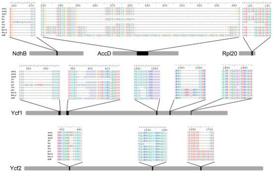 Among the annotated 79 protein-coding genes, 26 have perfectly conserved sequences and 48 have point mutations within the coding sequence, while five genes, namely accD, ndhB, rpl20, ycf1, and ycf2 are the most variable. The latter differ in gene length because of several insertions/deletions, also evident at the amino-acid level (Figure 3).