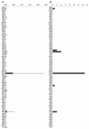 Figure 5. Results of molecular evolution analysis of plastid genes within the Capsicum genus. (A) Estimation of protein-coding gene divergence by the average branch length ± standard deviation for each gene tree; (B) number of putative sites under positive selection.