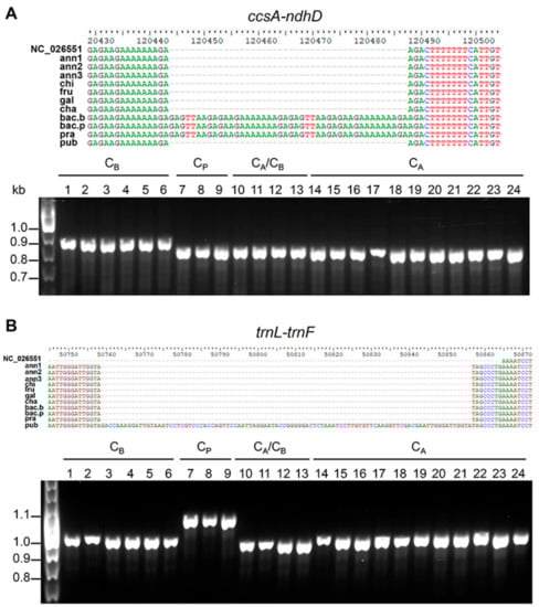 A preliminary experimental validation in representative species confirmed the presence of the tandem repeat detected in the ccsA–ndhD intergenic region in genotypes of the CB complex, and the insertion in the C. pubescens plastome of a sequence of 98 bp in length in the trnL–trnF region that was previously undescribed (Figure 6). The validation of other candidate markers listed in Table 2 is currently underway, and it will be the main objective of a future study.