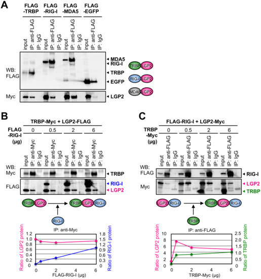 Next, to examine the possible indirect interaction of RIG-I with TRBP, we investigated whether TRBP, LGP2, and RIG-I can form triplet complex by immunoprecipitation assay using the expression plasmid of each gene in HEK293T cells (Figure 3B). At first, expression plasmids of TRBP-Myc and LGP2-FLAG were co-transfected with the increased concentrations of FLAG-RIG-I plasmid into the cells. Immunoprecipitation of TRBP protein by anti-Myc antibody revealed that TRBP certainly interacted with LGP2, but also interacted with RIG-I weakly at the increased concentration of FLAG-RIG-I, which can interact with LGP2 but not with TRBP (Figure 3B). Furthermore, FLAG-RIG-I and LGP2-Myc plasmids were co-transfected with the increased concentrations of TRBP-Myc plasmid, and immunoprecipitation of RIG-I protein by anti-FLAG antibody showed that RIG-I interacted with LGP2, and with TRBP weakly at the increased concentration of TRBP-Myc, which can interact with LGP2 but not with RIG-I (Figure 3C). These results suggest that TRBP, LGP2, and RIG-I form protein complex via LGP2, when their expression levels are sufficiently increased.