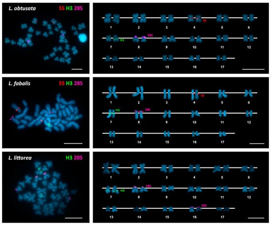 - Colomba, M.S.; Vitturi, R.; Castriota, L.; Bertoni, R.; Libertini, A. FISH mapping of 18S–28S and 5S ribosomal DNA, periwinkle Melarhaphe neritoides (Prosobranchia, Gastropoda, Cenogastropoda). Heredity 2002, 88, 381–384. [Google Scholar] [CrossRef] [PubMed]