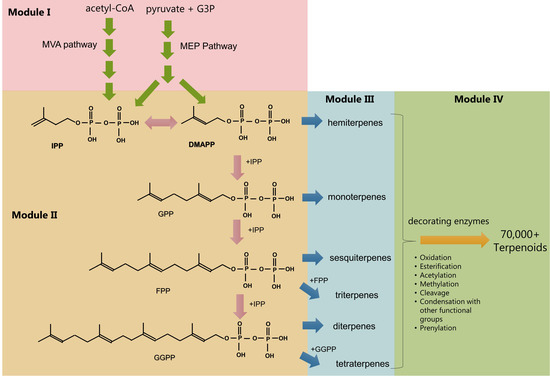 - Bian, G.; Deng, Z.; Liu, T. Strategies for terpenoid overproduction and new terpenoid discovery. Curr. Opin. Biotechnol. 2017, 48, 234–241. [Google Scholar] [CrossRef] [PubMed]