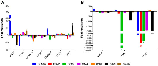 Afterwards, we evaluated the expression of the same ten genes after treatment with 2 mM VPA (Figure 2A,B). Results showed that VPA modulated Wnt signalling pathway genes in all the GSC lines (Figure 2A). In particular, WNT1 and FZD4 were upregulated in almost all the cell lines after 96 h of VPA treatment (except for FZD4 in GliNS2), CTNNB1 was downregulated in G179 and GliNS2, while in the other cell lines it showed no expression variations. CREBBP and EP300 were downregulated in five out of seven and two out of seven cell lines, respectively. The transcription factor TCF7 was upregulated in GBM2, GBM7 and G144 cells, while the downstream oncogene MYC showed a very heterogeneous expression among GSC lines after VPA administration; in particular, MYC was upregulated in GBM2 cell line and downregulated in GBM7, G144, and GliNS2, while in the other cell lines, the observed variations did not overcome the threshold value of −1.5. Finally, Wnt target genes showed an upregulation in all the cell lines (except for CD44 in GBM04), highlighting that VPA is able to induce an activation of this pathway (Figure 2B).