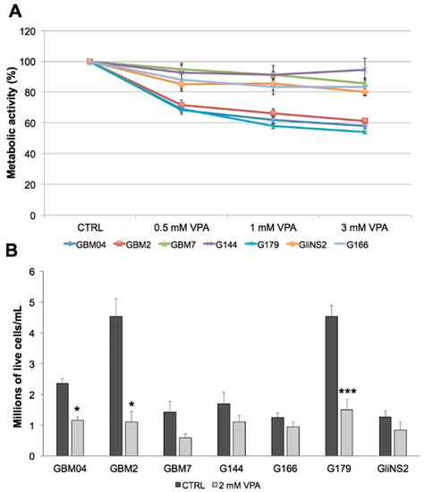 VPA inhibits GSCs proliferation. (A) Metabolic activity was analysed in seven GSC lines by MTT assay after 96 h exposure to escalating doses of VPA (0.5,1 and 3 mM). Bars represent SEM. For statistical analysis, see Table S1. (B) The proliferation rate was analysed by Trypan Blue dye exclusion assay after 96 h exposure to 2 mM VPA. Results are reported as the number of live cells/mL in treated samples compared to the matching untreated ones. Bars represent SEM. * p < 0.05; *** p < 0.001.