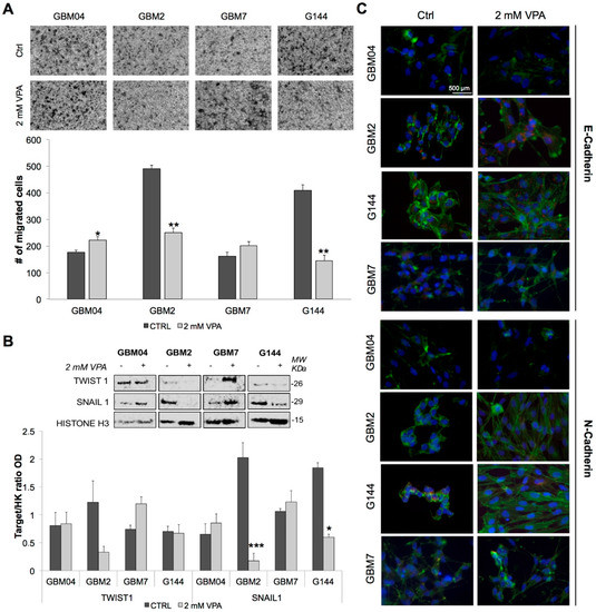 Since few studies have also elucidated that the Wnt/β-catenin pathway activation is able to enhance in vitro motility of GBM cells by activation of EMT [32], we next investigated whether the activation of the pathway induced by VPA could correlate with an effect on cell motility [24,42]. Surprisingly, the Boyden chamber assay revealed that VPA was able to induce a dramatic reduction of migrated cell number in two out of four cell lines (GBM2 and G144), whereas the other cell lines (GBM04 and GBM7) showed slightly-increased values in response to VPA exposure.