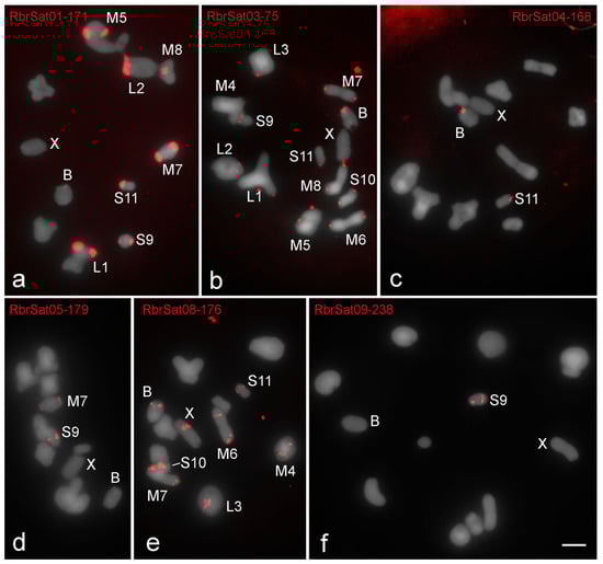 Fluorescent in situ hybridization (FISH) mapping on metaphase I of satDNAs identified in the genome of R. brasiliensis. The distinct satDNAs families are indicated. Chromosomes with signals, X and B chromosomes are identified. Note the presence on B chromosome of signals for (a) RbrSat01-171 (shared with some A chromosomes), (b) RbrSat03-36 (shared with all A chromosomes), (c) RbrSat04-168 (shared exclusively with pair S11), and (e) RbrSat08-176 (shared with some A chromosomes). For satDNAs (d) RbrSat05-179 and (f) RbrSat09-238 no signals were observed in B chromosome. Bar = 5 μm.
