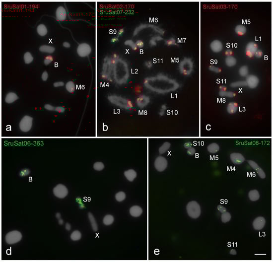 Chromosomal distribution of satDNAs in meiotic cells of S. rubiginosa (a,c,d,e) metaphase I and (b) diplotene. The distinct satDNAs families are indicated. Chromosomes with signals: X and B chromosomes are identified. Observe that the B chromosome harbors all satDNAs families, three of them shared with some A chromosomes (SruSat02-170, SruSat03-170, and SruSat08-172), and three exclusively shared with pair M6 (SruSat01-194) or pair S9 (SruSat06-363 and SruSat07-232). Bar = 5 μm.