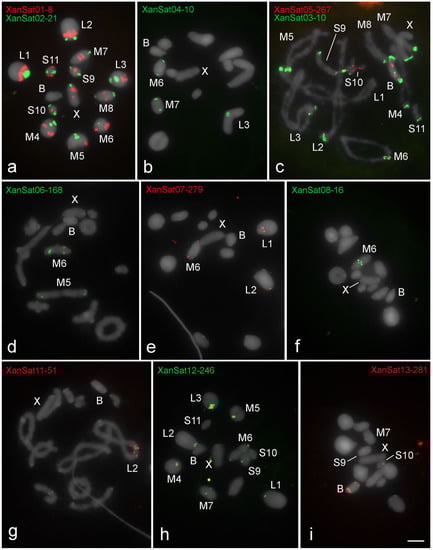 Patterns of chromosomal location revealed by FISH of eleven clustered satDNAs in X. d. angulatus. (a,b,d–f,h,i) metaphase I, (c,g) diplotene. The distinct satDNAs families are indicated. Chromosomes with signals: X and B chromosomes are identified. Note only three satDNA families on the B chromosome, XanSat03-10 (c), XanSat05-267 (c) and XanSat13-281 (i), all of which shared the pair S10. Multiply satDNA sites are observed for all satDNAs (a–e,h,i), except XanSat-08-16 (f) and XanSat11-51 (g). Bar = 5 μm.