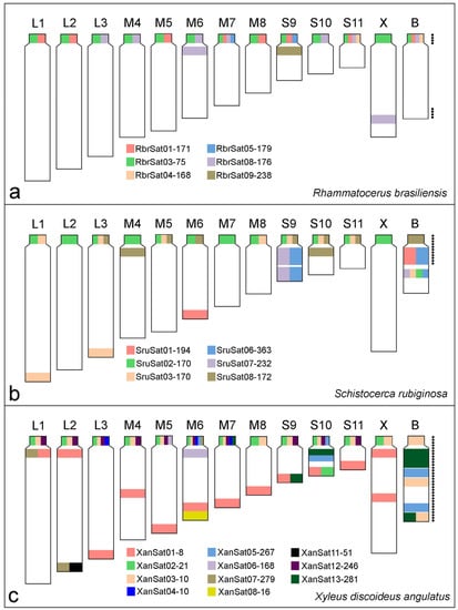 The distinct clustered satDNA families were variable in number and position within A chromosomes (Figure 2, Figure 3 and Figure 4). Only one satDNA was located exclusively on pericentromeric regions of A chromosomes in each species, RbrSat03-36 in R. brasiliensis (Figure 2b), SruSat02-170 in S. rubiginosa (Figure 3b), and XanSat03-10 in X. d. angulatus (Figure 4c). Heterochromatin blocks, like centromeres, were enriched in most satDNAs, but we also noticed a few satDNAs placed on the euchromatin of some chromosomes of R. brasiliensis: RbrSat08-176 (Figure 2e) and RbrSat09-238 (Figure 2f), and S. rubiginosa: SruSat03-170 (Figure 3c), SruSat06-363 (Figure 3d), SruSat07-232 (Figure 3b), and SruSat08-172 (Figure 3e). We observed that satDNA was more frequently distributed within the interstitial and distal euchromatin of X. d. angulatus (Figure 4a,c–g,i). The bias for pericentromeric position of satDNA was noticed by comparing the number of pericentromeric blocks with interstitial and distal ones for each species: R. brasiliensis twenty-eight pericentromeric and three interstitial; S. rubiginosa twenty-five pericentromeric, four interstitial, and five distal; X. d. angulatus forty-two pericentromeric, ten interstitial, and twelve distal (Table 2).