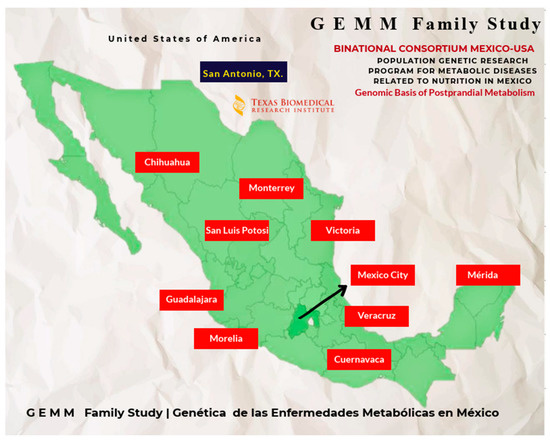 The GEMM (Genética de las Enfermedades Metabólicas en México/Genetics of Metabolic Diseases in Mexico Family Study) is a bi-national, multi-center collaborative study of cardiovascular risk phenotypes of metabolic origin (CVRMO) related to T2D and the risk of CVD [6]. The overall goal of this project is to identify the genetic and molecular processes involved in the development of these major public health threats in an effort to better diagnose and treat those who are afflicted or at risk [7]. Scientific oversight and coordination of GEMM is provided by a steering committee comprising investigators at Texas Biomedical Research Institute (Texas Biomed), San Antonio, TX, USA and the Mexican National Institute of Genomic Medicine (INMEGEN). Ten participating centers in Mexico have been carefully selected based on their affiliation with a medical university and/or teaching hospital. Each center has obtained funding in Mexico, including very substantial institutional commitments of resources and personnel, to set up a state-of-the-art diagnostic facility dedicated to GEMM and recruit participants [8] (Figure 1).