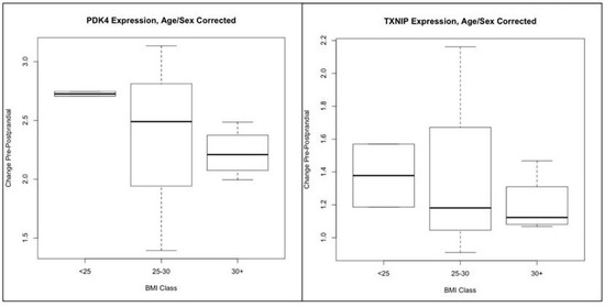 For transcriptomics preliminary data we are including a small pilot study of muscle gene expression using transcriptomic array data. Figure 3 and Table 4 show preliminary data for 9 GEMM participants from the same cohort of 16 healthy females for fasting vs. 3 h postprandial skeletal muscle tissue gene expression. These 9 females were divided in three groups (n = 3 each) with a BMI < 25, 25–30, and >30–32 transcripts were differentially expressed after the meal at a nominal p < 0.05. The two most strongly differentially expressed transcripts in muscle show a similar pattern: lower response in obese vs. healthy weight, and greater variation in the overweight (Figure 3).