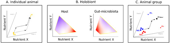 Influence of the gut microbiota on host nutrition. In these hypothetical examples, hosts and microbes are represented in a common nutrient space defined by two nutrients. Food types (grey lines) are defined by their ratio in nutrients X and Y. The animal host (yellow dot) and the microbes (blue and red dots), together forming the holobiont (grey surface), are charatcerized by their own nutritional states (animal: NSA; microbe: NSM; holobiont: NSH) and intake targets (animal: ITA; microbe: ITM; holobiont: ITH). (A) The animal is colonized by a single microbe type that does not influence its feeding behavior. The animal can reach the ITA by combining its intake of the two complementary foods (black arrows). The optimal ITH for both holobiont components is never reached. (B) The animal is colonized by a single microbe type that influences its feeding behaviors. The animal can reach an ITH that falls between ITA and ITM depending on the relative influence of the host and the microbes on feeding decisions. (C) The animal is colonized by two microbe types (assemblage of microbes) that both influence its feeding behavior. The animal can reach an ITH that falls between ITA, ITM1 and ITM2 depending on the relative influence of the host and the two microbe types on feeding decisions. In this example, microbe type 1 has a stronger influence on the feeding decisions of the host than microbe type 2. The same logic can be extended to richer microbial communities where a global effect of the microbial community can affect the animal feeding behavior.