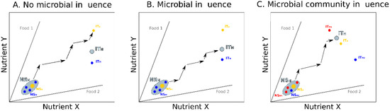 Several theoretical scenarios can then be considered. If the microbiota has no effect on the host feeding preferences, the host selects foods in order to reach and maintain its ITA (Figure 2A). In this case, the ITH cannot be reached. If the microbiota affects the host feeding preferences (e.g., [19]), the feeding behavior of the host mirrors the compromise between selective forces imposed by the host and the microbiota to reach their own intake targets. Nutrient intake by the host then depend on the relative influences of the two holobiont components in determining feeding decisions. If the nutritional interests of the host and its microbiota are in conflict any approach of the ITH towards the ITA moves the ITM away from its optimum, and vice versa. Depending on the composition of the microbial community, some microbe types may have more influence than others on the host behavior, and drag the nutrient intake towards their own ITM. Consequently, if only one microbe type colonizes the host (e.g., controlled experiments using gnotobiotic animals), host nutrient intake should follow nutritional rails leading somewhere between the ITA and the ITM and eventually ending on ITH (Figure 2B). In more natural conditions, where several microbe types colonize the host and compete (or cooperate) among themselves [55], the host nutrient intake should fall between the ITA and the different ITMs of all the microbe types, weighted for their relative influence on host feeding decisions (Figure 2C). In all cases, the microbiota can influence the NSA, by expanding the host’s capacity to assimilate nutrients [15,16], or by supplementing the host with new nutrients [17]. This may modify the host feeding choices, and lead the holobiont to reach the ITH. These interactions are expected to be highly dynamic since the composition of the gut microbiota can rapidly change as the host consumes different foods [4,22].