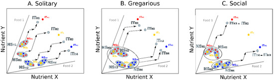 Concepts of nutritional geometry have also been used to explore the effects of nutrition on social interactions, an approach called “social nutrition” [28,29,30]. Here, nutrition models are used to study how nutrition affects many social behaviors and structures, such as collective movements [31], cooperative foraging [32], or reproductive division of labor [33]. In social species, individuals must often trade-off between choosing foods that address their own nutritional needs and following others’ choices to maintain social cohesion, which can generate a variety of social responses [28]. These interacting effects between nutrition and social behaviors can be modelled by considering all individuals constituting a social group in a common nutrient space (Reference [28]; Figure 1C). Each individual is defined by its own NS and attempts to reach its IT. The ability of the different group members to do so depends on the nature and the frequency of their social interactions (e.g., attraction [34], competition [35,36], cooperation [37]). In social insects, for example, nutrient balance is achieved collectively by the foragers that collect nutrients to reach a colony IT composed of the different ITs of all colony members, including the other workers that need carbohydrates for energy, and the larvae that need proteins for growth [38].