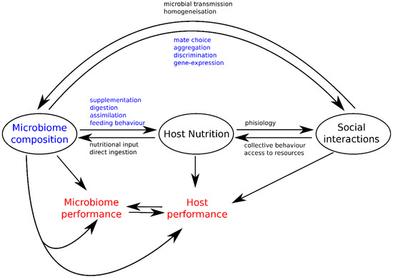 While nutritional studies have typically considered animal food intake and performance responses as a proxy of the intake target of an individual, growing evidence shows that these preferences vary among individuals, presumably because animal feeding decisions are influenced by several additional factors, including (but not only) its microbiota and social interactions [25]. Host nutritional choices can modify the relative abundance of microbe types in their gut by varying nutritional input available for microbial development [22] or through direct ingestion [18]. In turn, the gut microbiota composition can affect host nutrition by expanding [15], digesting and assimilating key nutrients for the host [17], or by dragging the host towards suboptimal diets [19]. Microbiota can intervene in gene-expression involved in social propensity [75], guiding mating choices [8,9], promoting aggregations [6,7], and mediating kin discrimination [39]. Conversely, social interactions favor the homogenization of the gut microbiota by increasing microbial transmission across individuals in the population [13,56]. Social interactions can also indirectly affect microbiota composition via the impact of collective behaviors during foraging [76] or differential access to resources [77].