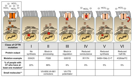 Classes of cystic fibrosis transmembrane conductance regulator (CFTR) mutations. Cystic fibrosis transmembrane conductance regulator mutations are categorized into 6 classes based on the mutation function or protein output []. A red “x” or arrow indicates where each CFTR mutant protein is affected. A common mutation example is listed for each class. * People with CF can have more than one mutation; thus, the percentage is representative of the entire population and does not add up to 100. Percentages acquired from the Cystic Fibrosis Foundation (U.S., 2017). ** Potentiators and correctors provide relief to some people with CF in these classes. Additional mutations have been approved for use of CFTR modulators.