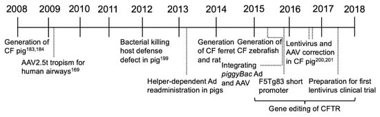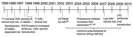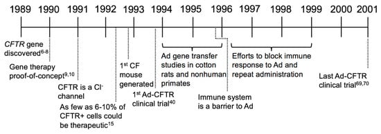 In this review, we will focus on the history of CF gene therapy, beginning with the discovery of the CFTR gene, continuing with the major milestones that have impacted the field, and looking to the future of CF gene therapy (Figure 2).