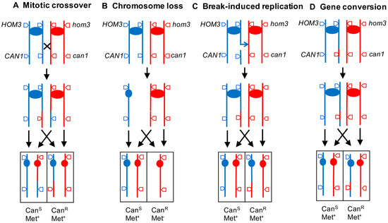 Although most long terminal loss of heterozygosity (LOH) events in wild-type cells are a consequence of mitotic crossovers, such events can also be produced by a non-reciprocal type of recombination called “break-induced replication” or BIR [22]. In this mechanism (Figure 1C), following a break on one homolog, one chromosome fragment is lost. The centromere-containing fragment invades the intact homolog and replicates the chromosome from the point of invasion to the telomere. The phenotype of the CanR product is identical to that obtained as the result of a crossover. However, if the daughter cell formed at the same time as the canavanine-resistant daughter can be analyzed, a distinction between a crossover and a BIR event can be made, since the daughter formed as a result of the crossover would be CAN1/CAN1, and that formed as the result of a BIR event would be can1/CAN1.
