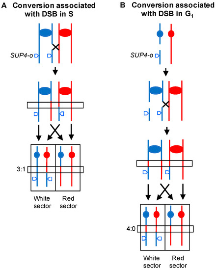 In the system shown in Figure 3, most (87%) spontaneous crossovers are associated with gene conversion events [23]. Conversions are detected by observing different breakpoints for the LOH events in each sector. In Figure 3A, in the boxed region, three of the four chromosomes that were involved in the recombination event have sequences derived from the W303-1A homolog, and one has YJM789-derived sequences; this type of conversion is called a “3:1” event. Very surprisingly, about two-thirds of the spontaneous crossovers were associated with a different type of conversion (4:0), in which all four chromatids had sequences derived from one of the two homologs (Figure 3B) [23,29]. Our interpretation of this pattern is that most of the spontaneous lesions that produced recombination between the homologs are generated in unreplicated chromosomes, likely in G1 of the cell cycle. Following DNA replication, the resulting broken chromosomes are repaired in G2 to produce the recombinant products. Thus, the analysis of events in sectored colonies allows us to make conclusions about the timing of the recombinogenic DNA lesions. In addition, the analysis of sectored colonies allows one to determine whether terminal LOH events are a consequence of crossovers or BIR. In our studies of genomic rearrangements induced by replication stress, we examined both unselected colonies as well as sectored colonies.