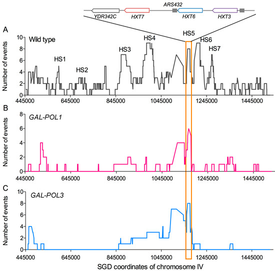 Mitotic recombination hotspots on the right arm of chromosome IV in wild-type, GAL1-POL1, and GAL1-POL3 strains. Crossover events on the right arm of chromosome IV were selected using the system described in Figure 3, and events were mapped using SNP microarrays. The Y axis of the plots represent the number of times a SNP is included in conversion tracts associated with a crossover; the X axis shows the SGD coordinates from CEN4 to the right telomere. (A) Recombination events in the wild-type diploid [23]. Hotspots of recombination activity are labeled HS1–HS7. HS5, which contains three directly oriented HXT genes, has high levels of recombination in all three strains. (B) Recombination in cells with low levels of Polα [12]. (C) Recombination in cells with low levels of Polδ [13].