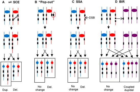 Large interstitial deletions and duplications are likely produced by different mechanisms than those that result in large terminal deletions and duplications. One common source of large interstitial deletions in yeast is homologous recombination between repeated genes located at non-allelic positions on either the sister-chromatid or on the homologs. Such exchanges can produce either deletions or duplications (Figure 6A), as well as other rearrangements to be described below. Interstitial deletions can also be generated by intrachromatid crossovers (“pop-outs”, Figure 6B) and single-strand annealing (Figure 6C) (reviewed by Symington et al. [22]). It is possible that all three mechanisms shown in Figure 6A–C are responsible for some proportion of deletions.