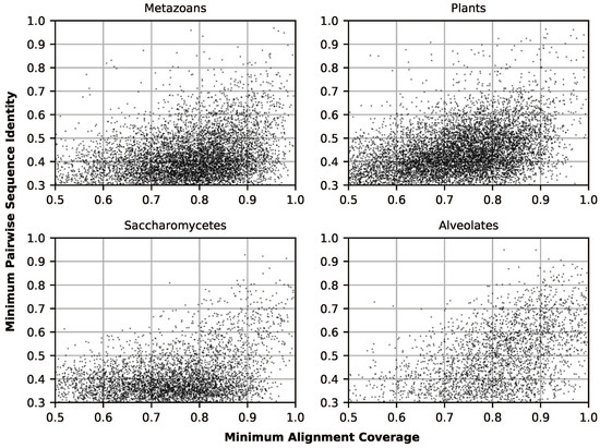 Scatterplots showing minimum pairwise sequence identity (fraction of matching aligned characters) and minimum alignment coverage (seq. length/alignment length) for all Metazoan, Plant, Saccharomycete, and Alveolate clusters used in analyses.