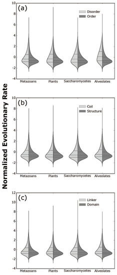 Mann-Whitney tests indicated that in all four eukaryotic datasets, disordered sites had higher median amino acid replacement rate scores than ordered sites (Δmedian_rate Metazoans: =+0.28, Plants: +0.33, Saccharomycetes: +0.29, Alveolates: +0.75). Similarly, coil sites had higher median rate scores than structured sites (Δmedian_rate Metazoans: +0.11, Plants: +0.12, Saccharomycetes: +0.03, Alveolates: +0.15) and linker sites had higher median scores than domain sites (Δmedian_rate Metazoans: +0.25, Plants: +0.30, Saccharomycetes: +0.25, Alveolates: +0.27). All median differences in all datasets were highly statistically significant (p < 2.2 × 10−16), but opposing rate distributions (e.g., order vs. disorder) exhibited large overlaps in their range of values (Figure 2). Notably, Mann-Whitney tests considering only sites from clusters where opposing structural properties co-occur (e.g., disordered and ordered sites found within the same alignment) were statistically significant as well (p < 2.2 × 10−16). Kruskal-Wallis tests comparing the eight factor-level combinations were statistically significant in all four datasets (p < 2.2 × 10−6), and most of the 28 post hoc multiple pairwise comparisons were also significant (corrected p < 0.05; see Supplementary Table S2).