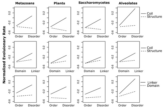 Previously, Ahrens et al. [9] used sequence-based predictors to show that site-specific evolutionary rates in Metazoan (Animal) proteins are partially governed by an interaction among three factors: intrinsic disorder propensity; secondary structure; and functional domain involvement. A strong statistical interaction was detected between conserved intrinsic disorder and conserved secondary structure, and sites which were predicted to be both intrinsically disordered and involved in secondary structures (“disordered-structured” sites) had lower mean rate scores than any other structural category [9,10].