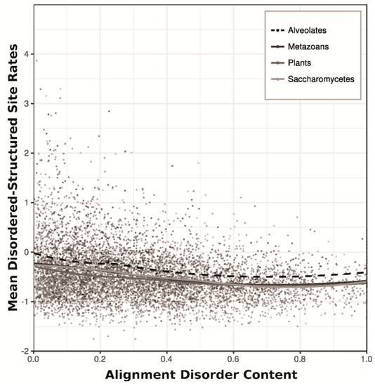 Loess regression indicated a negative correlation between sequence evolutionary rates of disordered-structured sites and the overall disorder content (fraction of disordered sites) in their respective alignments (Figure 4). This trend is less pronounced in Alveolate alignments than in the other three datasets.