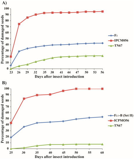 | F2:3-B2 (set I) | % damaged seeds | 166 | 121:45 | 0.3936 (0.5304) |