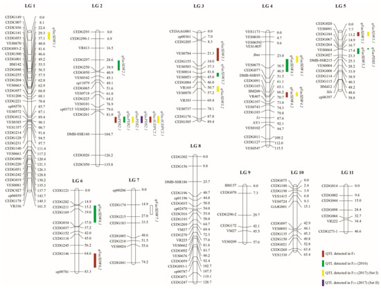 | Population | Trait | LG a | QTL name | Position b | Franking Markers | LOD | PVE c (%) | Add d | Dom e |