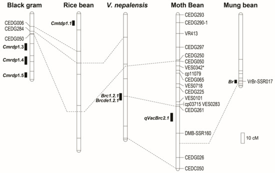 - Somta, P.; Kaga, A.; Tomooka, N.; Kashiwaba, K.; Isemura, K.; Chaitieng, B.; Srinives, P.; Vaughan, D.A. Development of an interspecific Vigna linkage map between Vigna umbellata (Thunb.) Ohwi & Ohashi and V. nakashimae (Ohwi) Ohwi & Ohashi and its use in analysis of bruchid resistance and comparative genomics. Plant Breed. 2006, 125, 77–84. [Google Scholar] [CrossRef]