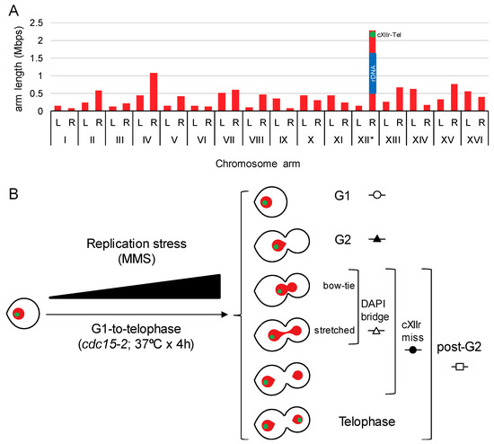Yeast chromosome arm lengths and cell morphologies obtained after a G1-to-telophase synchronous cell cycle. (A) Chart of S288C chromosome arm lengths. Length of chromosome XII right arm (cXIIr) in an estimate considering 150 copies of the 9.1 Kb ribosomal DNA (rDNA) unit. L, left arm; R, right arm; blue rectangle, rDNA array; green dot, position of the engineered tetOs array present in all strains of this study. (B) Schematic of the G1-to-telophase experiments, undertaken in this study under increasing doses of replication stress, and the main end-point cell figures considered for analysis. Red, main nuclear mass stained by DAPI, green spot, cXIIr subtelometic region (Tel-cXIIr) as seen by the tetOs/tetR-YFP reporter.