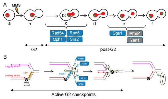 Joint molecules arise upon synapsis of one DNA strand with the complementary strand of the sister chromatid and can be the consequence of the invasion of one end coming from a DSB, the switch of the leading strand DNA template to bypass a SRF, or else, the switch of the template to fill up a ssDNA gap in one sister chromatid [2,3]. Common to all these variants, the first synaptic event is the formation of a JM termed displacement loop (D-loop). To accomplish synapsis, acceptor DNA must first be single-stranded and coated with the replication protein A (RPA) complex. Then, RPA is displaced by Rad51 to form the ssDNA-Rad51 filament, which starts the search for homology along the donor sister chromatid. Once satisfactory homology is found, the D-loop is shaped by the displacement of the non-complementary donor strand, which then becomes coated by RPA [4,5]. Aside from Rad51, there are other key players during these early HR steps. Thus, important catalysts for DNA synapsis in yeast are Rad52 and other members of its epistasis group such as Rad54. Antagonists of the HR synapsis also exist; for instance, the helicase Srs2 is capable of disassembling the Rad51 filament. Once a stable D-loop has been formed, postsynaptic steps complete HR. In all cases, DNA synthesis will be required. In the synthesis dependent strand annealing (SDSA) pathway, the D-loop remains as the priming substrate for copying the information from the donor sister chromatid and then it is dismantled. Alternatively, the D-loop can be further processed into one or two cross-shaped JM termed Holliday junction (HJ). D-loops and HJs can be resolved by endonucleolytic enzymes or, just in the case of D-loops, by the sole action of DNA helicases [6,7,8]. There is, though, a high degree of specificity for the resolution of each structure. Thus, D-loops are disassembled by the helicase Mph1 (Fanconi anaemia complementation group M, FANCM, in humans), whereas HJs can be resolved by specialised structure selective endonucleases (SSEs), and double HJs (dHJ) by a dissolution pathway which involves the helicase-topoisomerase complex Sgs1-Top3-Rmi1 (STR). This complex is homologous to the human Bloom’s syndrome BLM–TopoIIIa–RMI1–RMI2 complex. In yeast, there are three SSEs able to resolve HJs: the heterodimer complexes Mus81-Mms4 (MUS81-EME1 in humans) and Slx1-Slx4 (SLX1-SLX4/FANCP in humans), and the resolvase Yen1 (GEN1 in humans).