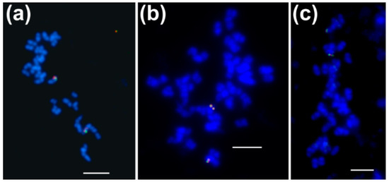 Localization of BAC clones in metaphase mitotic chromosomes was performed with the use of fluorescent in situ hybridization (BAC-FISH). BAC probe labelling, chromosome squash preparation, and the FISH procedure was done according to the protocol [34]. The quality of chromosome slides was checked under a phase-contrast microscope BX41 (Olympus, Tokyo, Japan). After FISH, slides were examined with an epifluorescence microscope BX60 (Olympus) using the Cell_F software (Olympus). Images were captured using a CCD monochromatic camera and superimposed using Micrografx Picture Publisher 8 (Corel, Ottawa, ON, Canada).