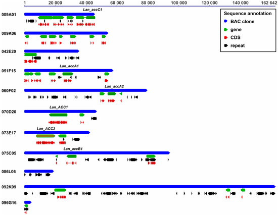 Twelve BAC clones were selected for sequencing including those carrying genes in question (Lan_ACC1, Lan_ACC2, Lan_accA1, Lan_accA2, and Lan_accB1) and a few “random” ones. The sequencing provided 2.6 mln reads per clone (ranging from 0.4 to 5.1 mln), resulting in an average sequence coverage of 9700×. Full-length insert sequences were recovered for all BACs except two clones from “random” sub-library (089L06 and 096G16). Excluding these two truncated inserts, the length of BAC sequences varied from 31,722 to 162,642 bp, with an average value of 65,220.1 bp (Table 4). This is about 35% less than the average value calculated for the genome BAC library as well as 32.5% less than the average value for clones selected by hybridization from this library in previous studies [31,32,33,90]. BAC clone 011G20 was shown to be fully nested within the 075C05 clone and therefore was discarded from further analyses.