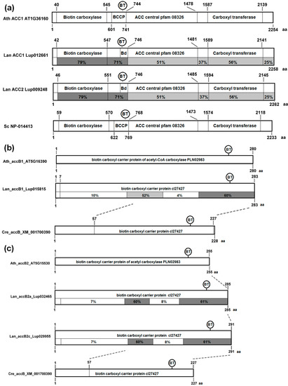 Subunits of plastid ACCase revealed different degrees of conservation resulting from different selective pressures. The BCCP (accB) homologs possess two conserved regions: one shorter in the center of the protein and another longer located on the C-terminus (Figure 3b,c). The biotinylation site is located in the C-terminal conserved region. The C-terminal region of plant BCCP carrying both conserved regions is homologous with cyanobacterial protein, whereas the N-terminal region does not show any significant similarity to bacterial ancestor. The L. angustifolius BCCP1 is more conserved than BCCP2, but the difference is very small (60% vs. 52% in the middle domain) and might result from lower number of analyzed proteins in the BCCP1 clade.