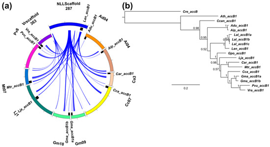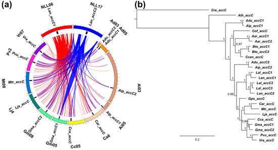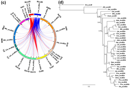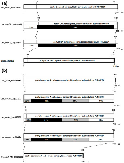 Sequence collinearity of genome regions carrying ACCase genes was analyzed in ten legume species. Highly conserved synteny, evidenced by high total score values of sequence alignments, was observed for Lan_accB2c, Lan_ACC2, and Lan_ACC1 regions. The least conserved collinearity was revealed for Lan_accB1. Regions surrounding ACC and accA genes revealed synteny to other genome regions carrying these genes as well as to other regions lacking any appropriate homolog. Genome regions carrying accB and accC genes were syntenic only to those encoding corresponding homologs. The pattern of synteny indicated lineage-specific duplications of ACC (L. angustifolius, M. truncatula and G. max), accA (L. angustifolius and G. max), accB1 (G. max), and accC (L. angustifolius and G. max) genes. accB2 genes revealed a complex pattern, indicating both lineage-specific and ancestral duplications. No synteny between accB1 and accB2 genome regions was observed. The representatives of accB1 and accB2 genes were found in all legume taxa having sequenced genomes. The presence of accB1 and accB2 genes in the genome of a model plant, A. thaliana, highlights early separation of these genes in plant evolution (Tables S7–S10). Patterns of synteny observed for sequences: Lan_ACC1 vs. Lan_ACC2, Lan_accA1 vs. Lan_accA2 vs. Lan_accA3, Lan_accB2a/Lan_accB2b vs. Lan_accB2c, and Lan_accC1 vs. Lan_accC2 were similar to each other, evidencing ancient whole-genome duplication event (Figure 5a, Figure 6a, Figure 7a,c and Figure 8a). In other legume species, the synteny provided evidence for WGD-based origin of Gma_ACC1, Gma_ACC2; Gma_accB1a, Gma_accB1b; Adu_accB2a, Adu_accB2b; Aip_accB2a, Aip_accB2b; Cca_accB2a, Cca_accB2b; Gma_accB2a, Gma_accB2b, Gma_aacB2c; Lja_accB2a, Lja_accB2b; Mtr_accB2 and Mtr_accB2b genes. Tandem duplications contributed to the evolution of Mt_ACC1, Mt_ACC2; Gma_accA1, Gma_accA2, Gma_accA3; Lan_accB2a, Lan_accB2b; Pvu_accB2a, Pvu_accB2b; Vra_accB2a and Vra_accB2b. Genes Adu_accA2, Aip_accA2, Adu_accC1 and Aip_accC1 were revealed to arise by single gene duplications.
