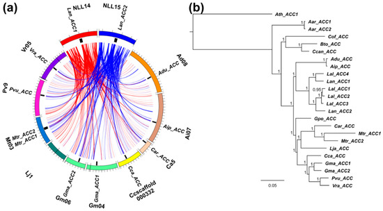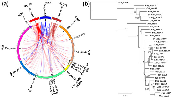 Comparative mapping and phylogenetic inference of legume biotin carboxylase (accC) subunit genes of plastid ACCase. (a) syntenic patterns revealed for narrow-leafed lupin genome regions and corresponding regions of legume chromosomes. Abbreviated species names are provided as follows: Aar, Acacia argyrophylla; Adu, Arachis duranensis; Aip, A. ipaensis; Ath, Arabidopsis thaliana; Bto, Bauhinia tomentosa; Car, Cicer arietinum; Cca, Cajanus cajan; Ccan, Cercis canadensis; Cof, Copaifera officinalis; Cre, Chlamydomonas reinhardtii; Gma, Glycine max; Gpo, Gompholobium polymorphum; Lal, Lupinus albus; Lan, L. angustifolius; Lja, Lotus japonicus; Mtr, Medicago truncatula; Pvu, Phaseolus vulgaris; Vra, Vigna radiata. ACCase gene loci are indicated by black bars. Ribbons visualize homologous links identified by DNA sequence alignments. L. angustifolius genomic sequences and homology links are marked by colors: red and blue. (b) majority rule consensus trees found in a Bayesian analysis of legume accC genes. Numbers are posterior probabilities. The length of MAFFT alignment used for phylogenetic inference was 1716 nt.